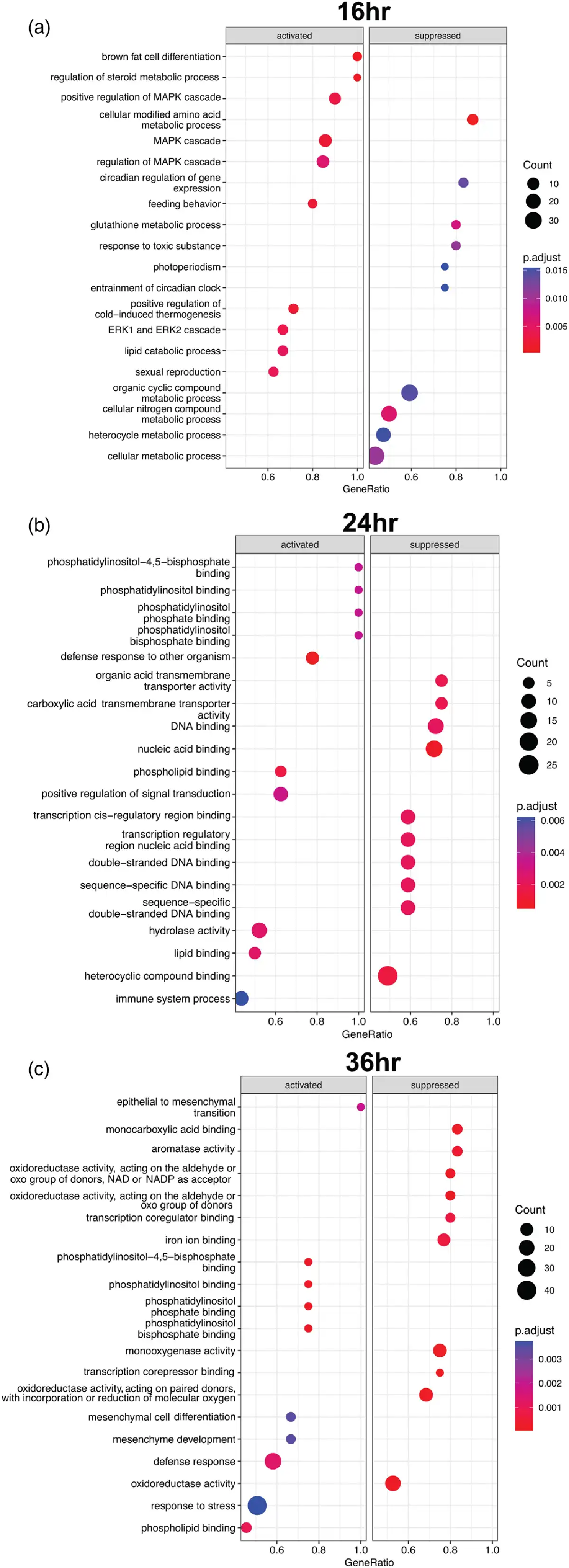 Gene set enrichment analysis of a non-permissive host during infection. (a) GO enrichment analysis of suppressed (downregulated) and activated (upregulated) DEGs at 16 h, (b) 24 h and (c) 36 h post-infection with A. ceylanicum. The colour represents the P-adjusted value, and size represents the number of genes that fall into each GO category. GeneRatio is the fraction of genes with the given GO term.