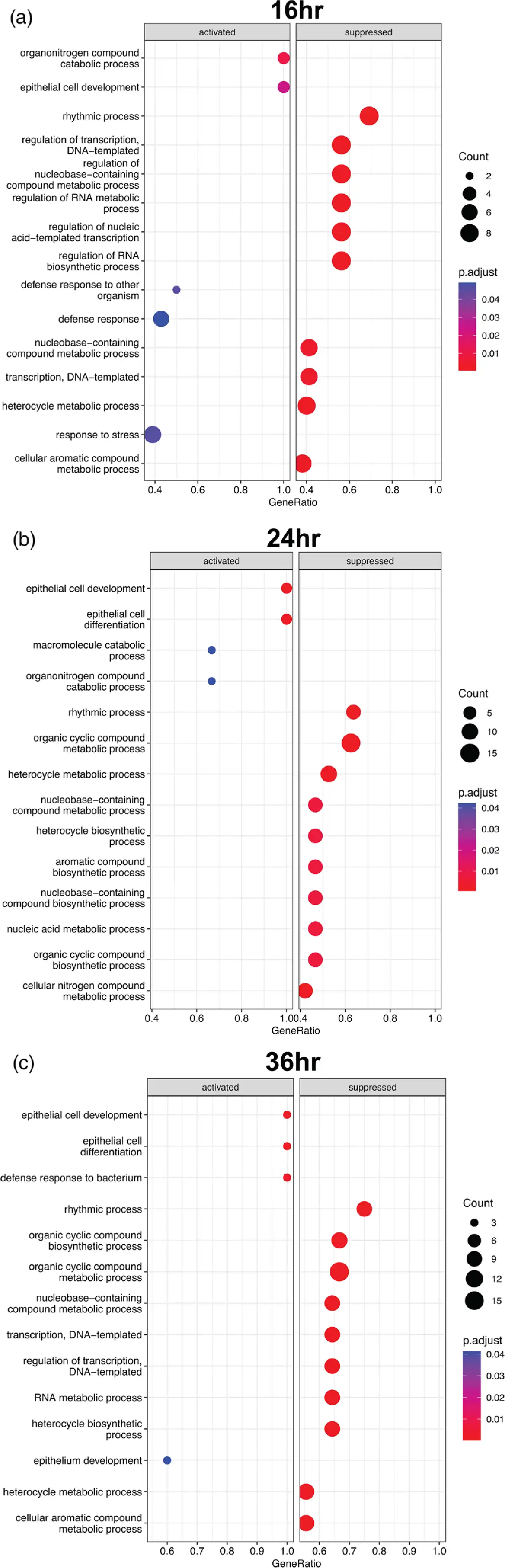 Gene set enrichment analysis of a permissive host during infection. (a) GO enrichment analysis of suppressed (downregulated) and activated (upregulated) DEGs at 16 h, (b) 24 h and (c) 36 h post-infection with A. ceylanicum. The colour represents the P-adjusted value, and size represents the number of genes that fall into each GO category. GeneRatio is the fraction of genes with the given GO term.