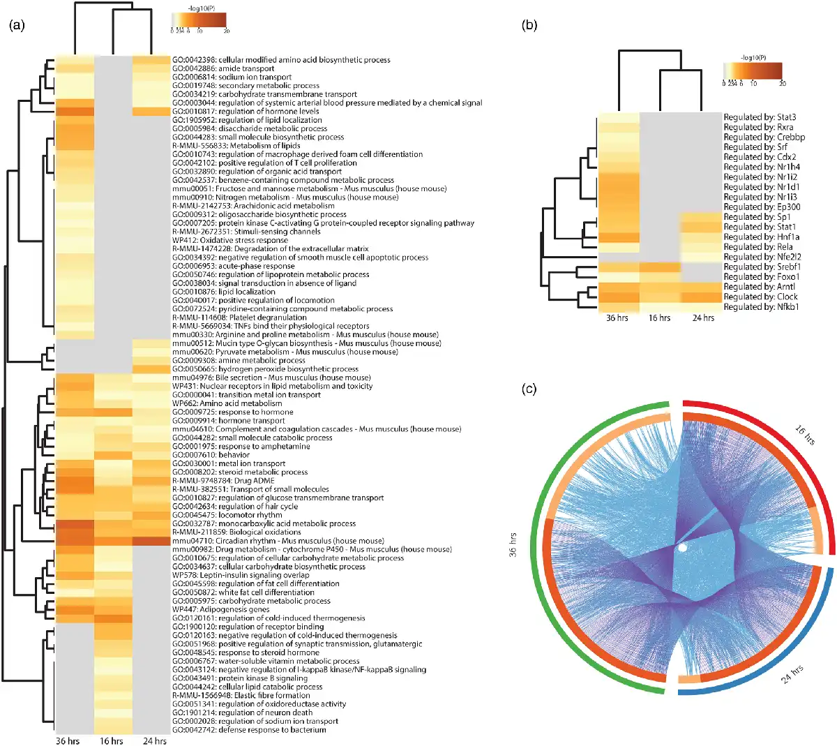Overlapping DEGs and GO terms across time in mice and hamsters were visualized with Circos plots, showing that mice have a higher overlap of DEGs and GO terms across all time points. Mice also showed a higher amount of DEGs and new GO functions at 36 h, compared to hamsters (Figs 4c and 5c).