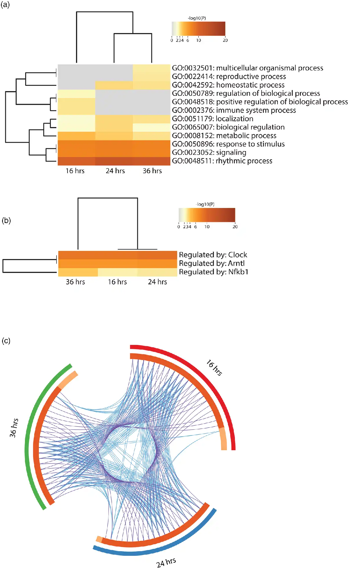 The enrichment of targets from conserved transcriptional regulators was also examined. Enriched targets from 20 transcription factors in mice were found, in which 13 of these are potentially related to an immune response (Nfe2l2, Nr1i3, Nr1i2, Nr1d1, Nr1h4, Rxra, Cdx2, Srf, Crebbp, Stat1, Stat3, Sp1 and Rela) (Fig. 4b). In hamsters, enriched targets from 3 transcription factor hits were present, all of which may play a role in immune function (Fig. 5b). Both species had increasing expression values for nfkb1 gene targets across time, though hamsters had a slightly more enriched response at all time points [e.g. 4 vs 3-log10(P) at 36 h] (Figs 4b and 5b). Targets from the circadian rhythm target genes, Clock and Arntl, which control the temporal gating of cytokine production and chemokine attraction (Vieira et al., ), did not change across the time points in hamsters but had a slight increase across time in mice.