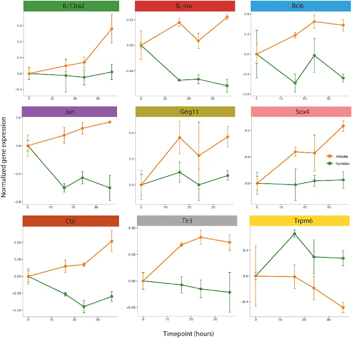Transcriptome analysis of candidate DEGs responsible for infection outcome. Averaged normalized gene expressions from 4 time points with 3 mouse (orange) and 3 hamster (green) samples per time point (0, 16, 24 and 36 h). Error bars represent the standard deviation. Each gene colour correlates to their location in the proposed mechanism against hookworms shown in Fig. 7.