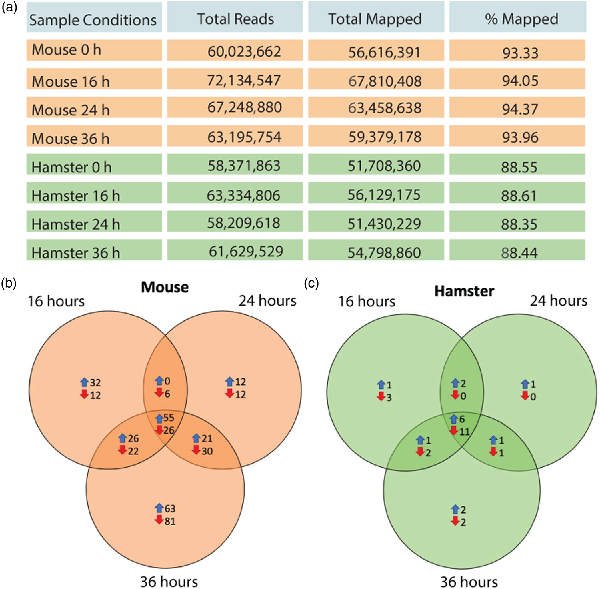 Transcriptomic profiles were generated for the small intestine in mice and hamsters at 4 different time points, each with 3 biological replicates; 0, 16, 24 and 36 h post-infection, resulting in ~2000 DEGs. Mouse replicates had substantial differences between each time point while variation was observed in the hamster replicates within time points (Fig. S1). Reads mapped to the genomes were >88% for hamsters and >93% for mice across all time points (Fig. 1a). Mice exhibited a greater number of DEGs overall compared with hamsters. At 36 h, the highest number of DEGs for mice was identified, which were 63 upregulated DEGs and 81 downregulated DEGs (Fig. 1b). In hamsters, however, the number of DEGs was similar and low across all separate time points, ranging from 0 to 3 for both up- and downregulated DEGs. In hamsters, a core set of DEGs in the nexus of all time points was observed: 6 upregulated and 11 downregulated DEGs (Fig. 1c).