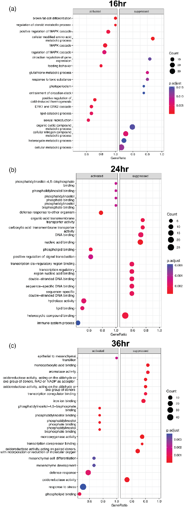Gene set enrichment analysis of a non-permissive host during infection. (a) GO enrichment analysis of suppressed (downregulated) and activated (upregulated) DEGs at 16 h, (b) 24 h and (c) 36 h post-infection with A. ceylanicum. The colour represents the P-adjusted value, and size represents the number of genes that fall into each GO category. GeneRatio is the fraction of genes with the given GO term.