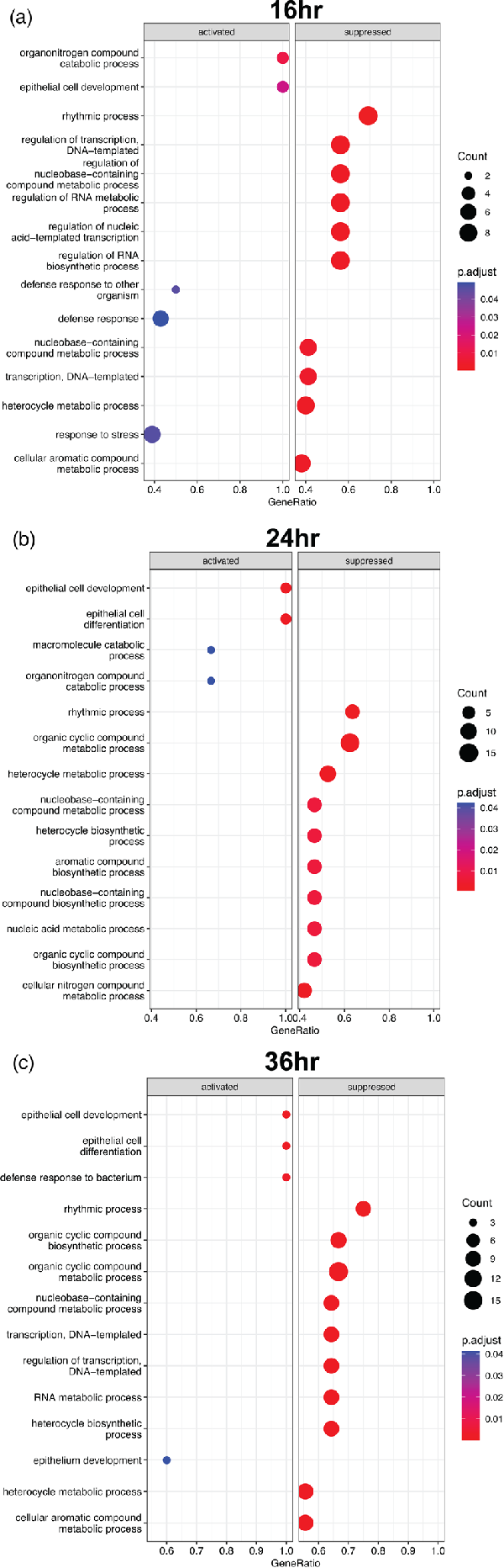 Gene set enrichment analysis of a permissive host during infection. (a) GO enrichment analysis of suppressed (downregulated) and activated (upregulated) DEGs at 16 h, (b) 24 h and (c) 36 h post-infection with A. ceylanicum. The colour represents the P-adjusted value, and size represents the number of genes that fall into each GO category. GeneRatio is the fraction of genes with the given GO term.