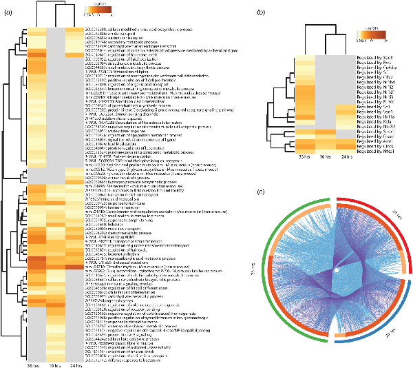 Enrichment analysis and overlap of statistically enriched GO terms in a permissive host. (a) Heatmap of enrichment analysis of statistically enriched GO terms for each infection time point. (b) Heatmap of enrichment analysis of all statistically enriched transcription factor targets across various time points. (c) Circos plot showing identical DEGs (purple) and GO term overlap (blue) across time points. Outer arcs represent the listed time points, while dark orange arcs represent DEGs that hit multiple time points. Gene ontologies that are unique to a time point are shown under the light orange arc.