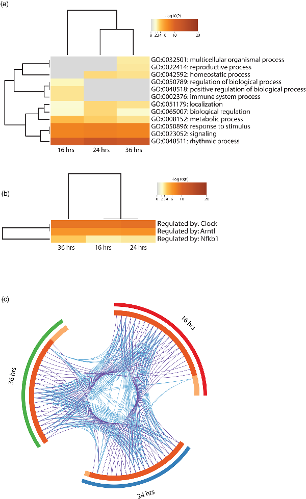 The enrichment of targets from conserved transcriptional regulators was also examined. Enriched targets from 20 transcription factors in mice were found, in which 13 of these are potentially related to an immune response (Nfe2l2, Nr1i3, Nr1i2, Nr1d1, Nr1h4, Rxra, Cdx2, Srf, Crebbp, Stat1, Stat3, Sp1 and Rela) (Fig. 4b). In hamsters, enriched targets from 3 transcription factor hits were present, all of which may play a role in immune function (Fig. 5b). Both species had increasing expression values for nfkb1 gene targets across time, though hamsters had a slightly more enriched response at all time points [e.g. 4 vs 3-log10(P) at 36 h] (Figs 4b and 5b). Targets from the circadian rhythm target genes, Clock and Arntl, which control the temporal gating of cytokine production and chemokine attraction (Vieira et al., ), did not change across the time points in hamsters but had a slight increase across time in mice.