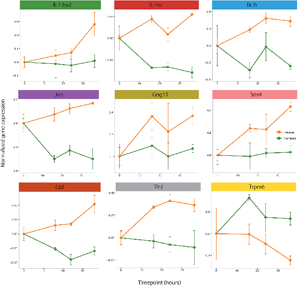 Transcriptome analysis of candidate DEGs responsible for infection outcome. Averaged normalized gene expressions from 4 time points with 3 mouse (orange) and 3 hamster (green) samples per time point (0, 16, 24 and 36 h). Error bars represent the standard deviation. Each gene colour correlates to their location in the proposed mechanism against hookworms shown in Fig. 7.