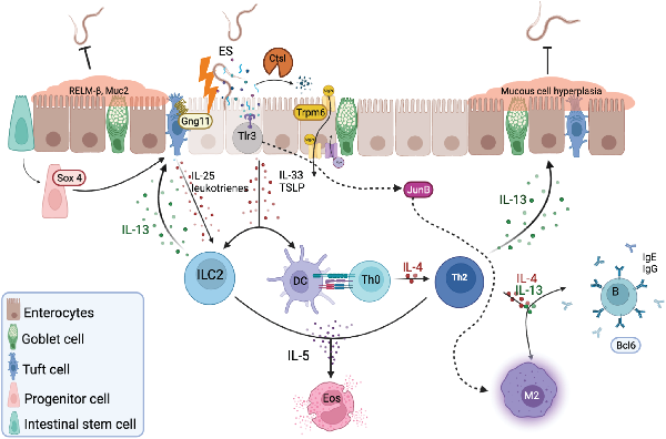 Representative schematic of the small intestine during helminth infection. After larval migration through the lungs and intestinal mucosa, epithelial cells secrete various alarmins in response to intestinal damage and ESPs, including IL-33 and thymic stromal lymphopoietin (TSLP). These products together with IL-25 and leukotrienes produced by G protein-coupled receptor signalling in tuft cells promote the activation and differentiation of type 2 innate lymphoid cells (ILC2) and CD4 T helper 2 (Th2) cells. ILC2-derived IL-13 will promote tuft and goblet cell differentiation and hyperplasia, ultimately expelling the worm. Th2 secretion of IL-4, IL-5 and IL-13 lead to eosinophil activation, differentiation of M2 macrophages, induction of parasite-specific IgG and IgE, and contributes to the smooth-muscle cell contractility, intestinal permeability and RELM-beta secretion. The additional proposed mechanisms here consist of the transcription factor SOX4 which may promote differentiation of tuft cells, while G protein-coupled receptors, such as GNG11, activate tuft cells in response to unknown helminth ESPs. The protease CTSL may downgrade ESPs and process antigens, while TLR3 binds parasitic nucleic acids to activate JUN regulation of Th1 and Th2 response, by either promoting the classical M1 polarization, or IL-4, which will activate the alternative M2 phenotype. Signalling by TRPM6 acts as a positive signal in a permissive host by providing nutrients such as Mg to the parasite to survive and conduct their biological processes within the host.