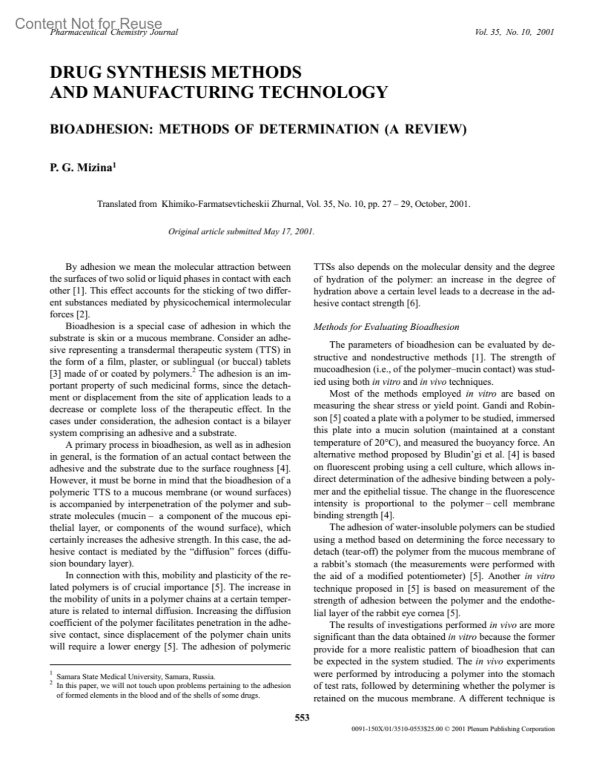 DRUG SYNTHESIS METHODS AND MANUFACTURING TECHNOLOGYBioadhesionMethods of Determination (A Review)Mizina, P. G.Author information1Samara State Medical University, Samara, Russia.Pharmaceutical Chemistry Journal 35(10):p 553-555, October 2001.Copyright ©2001 Kluwer Academic Publishers