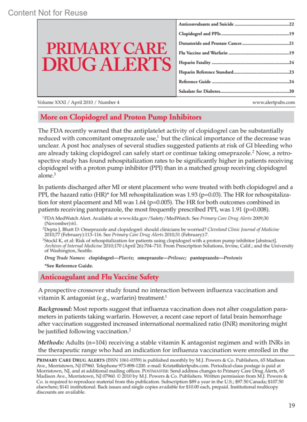 Anticoagulant and Flu Vaccine SafetyPrimary Care Drug Alerts 31(4):p 19-20, April 2010.Copyright ©2010 M. J. Powers & Co. Publishers