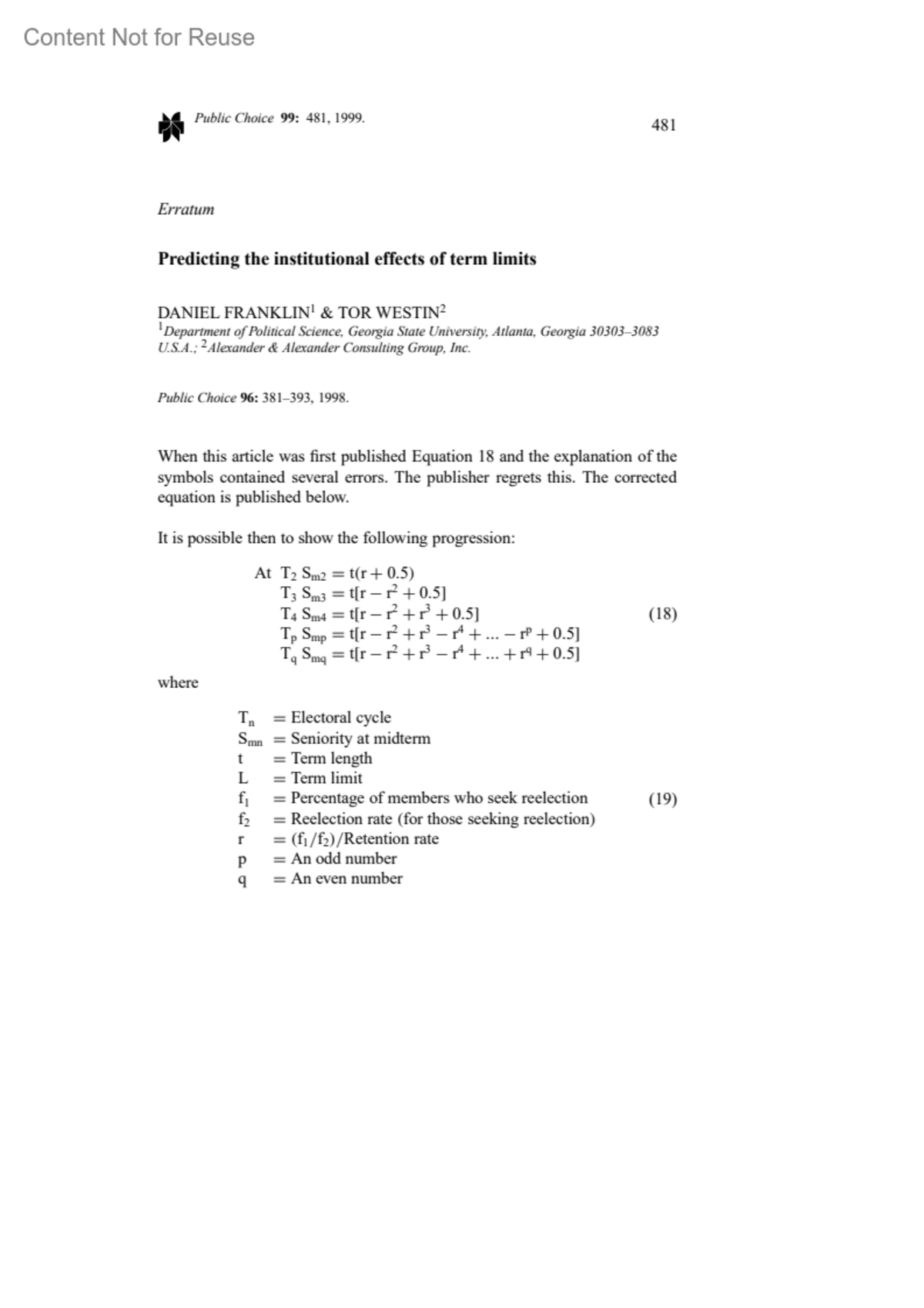 Predicting the institutional effects of term limitsFranklin, DanielWestin, TorAuthor information1Department of Political Science, Georgia State University, Atlanta, Georgia 30303-3083 U.S.A.2Alexander & Alexander Consulting Group, Inc.Public Choice 99(4):p 481, June 1999.Copyright ©1999 Kluwer Academic Publishers