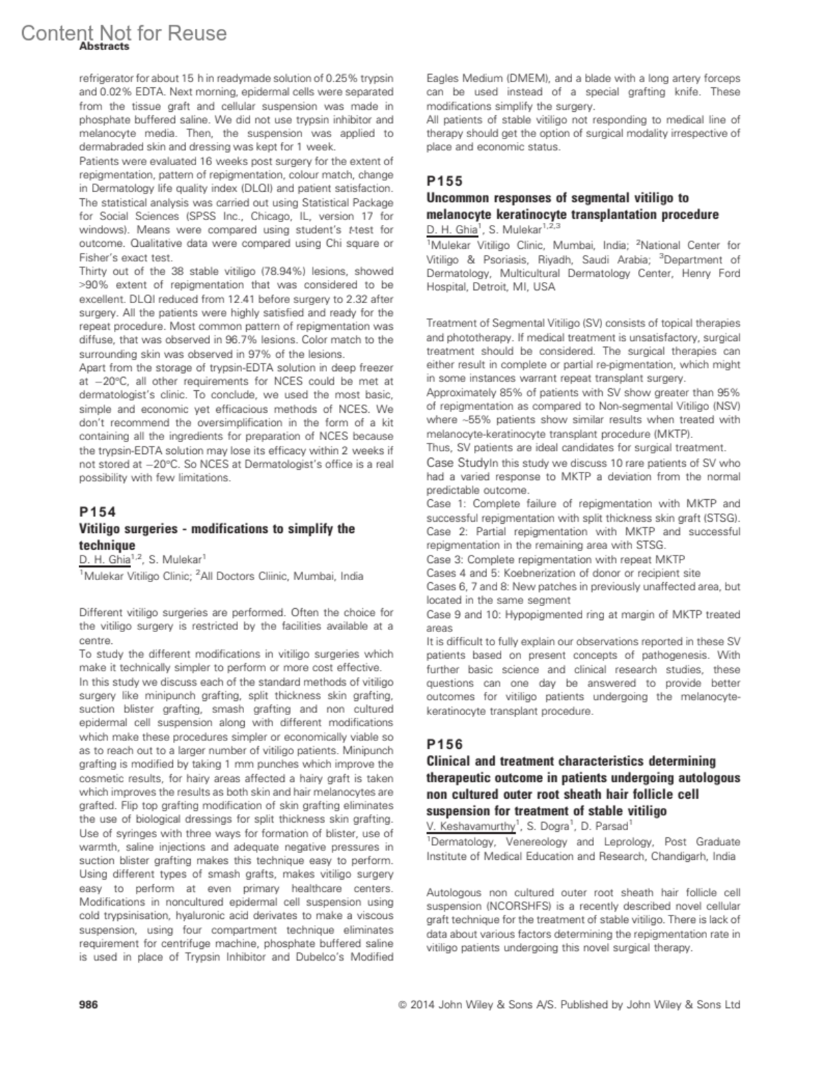 Uncommon responses of segmental vitiligo to melanocyte keratinocyte transplantation procedureP155Ghia, D. H.Mulekar, S.Author information1 Mulekar Vitiligo Clinic, Mumbai, India2 National Center for Vitiligo & Psoriasis, Riyadh, Saudi Arabia3 Department of Dermatology, Multicultural Dermatology Center, Henry Ford Hospital, Detroit, MI, USAPigment Cell & Melanoma Research 27(5):p 986, September 2014.Copyright © 2014 John Wiley & Sons, Ltd