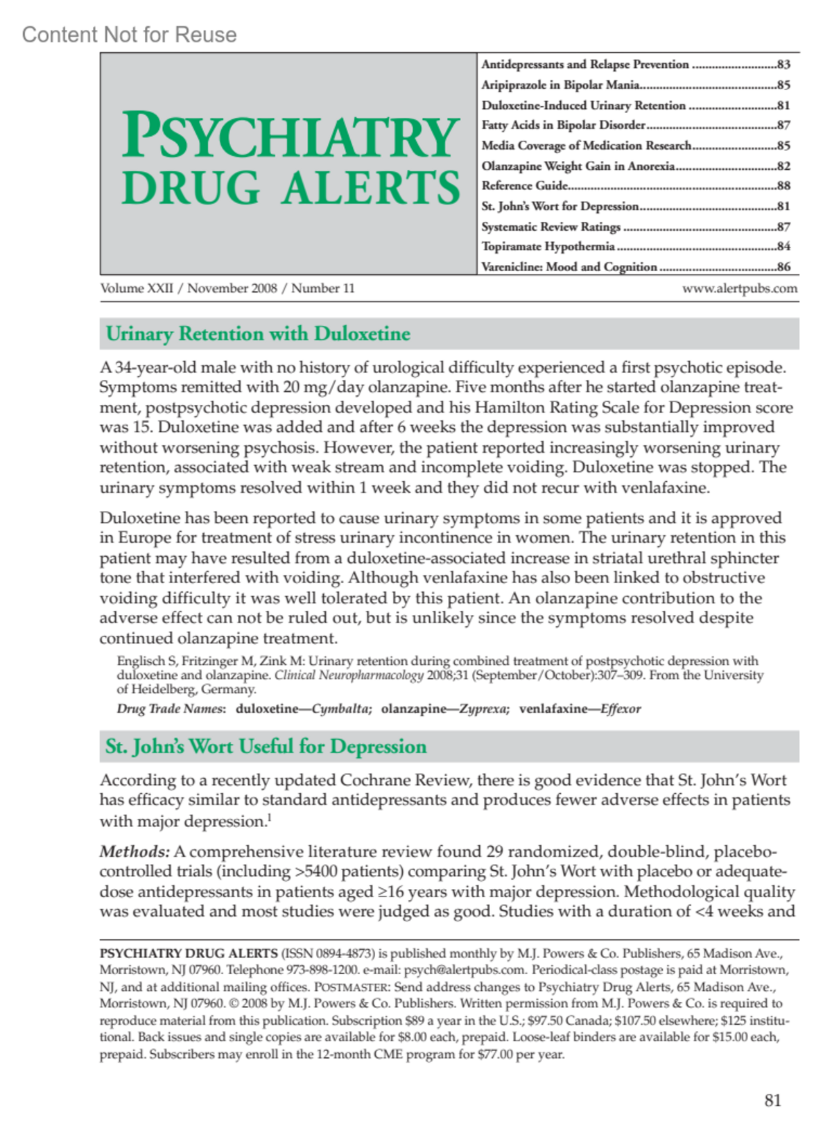 St. John's Wort Useful for DepressionPsychiatry Drug Alerts 22(11):p 81-82, November 2008.Copyright ©2008 M. J. Powers & Co. Publishers
