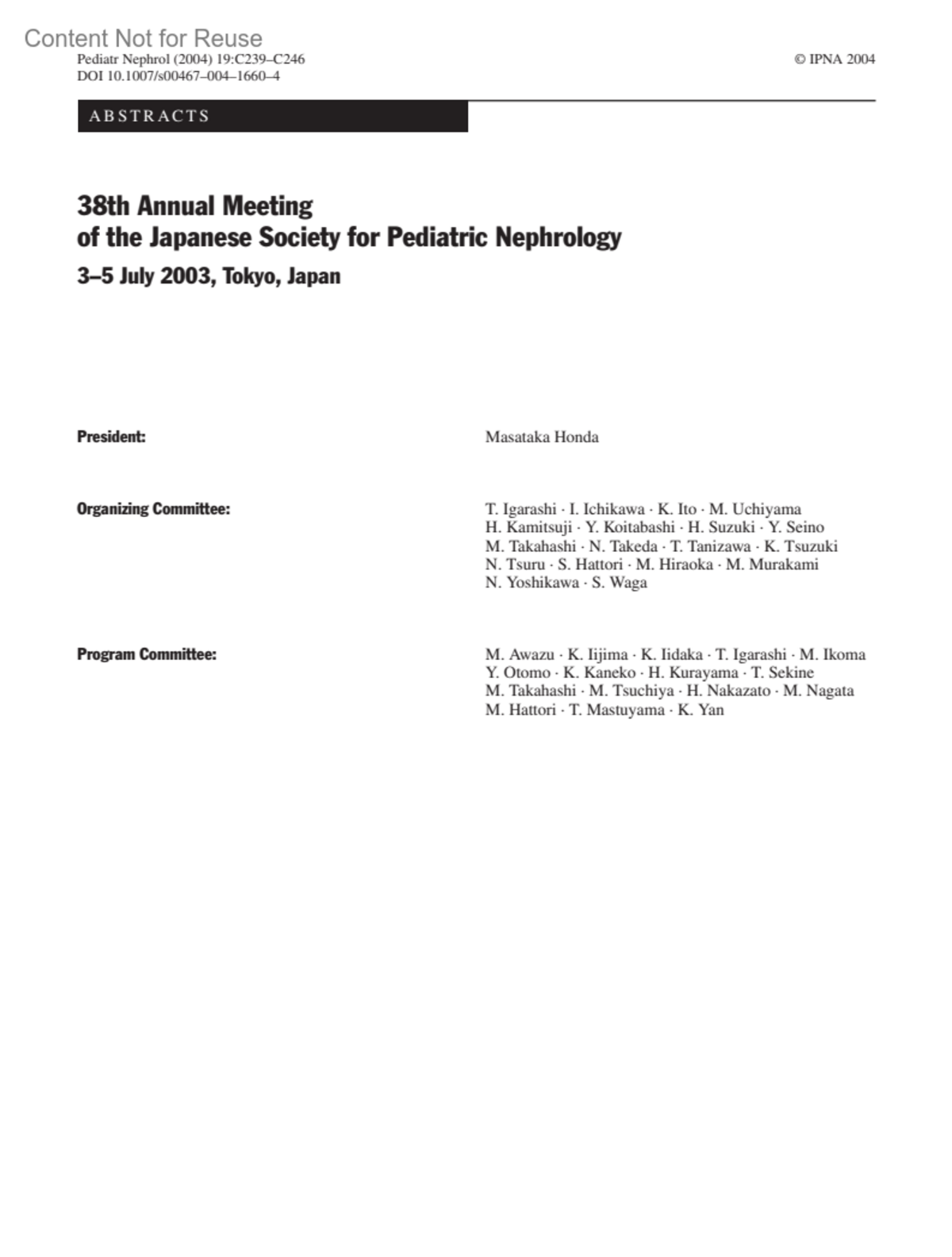 38th Annual Meeting of the Japanese Society for Pediatric Nephrology, 3 - 5 July 2003, Tokyo, Japan