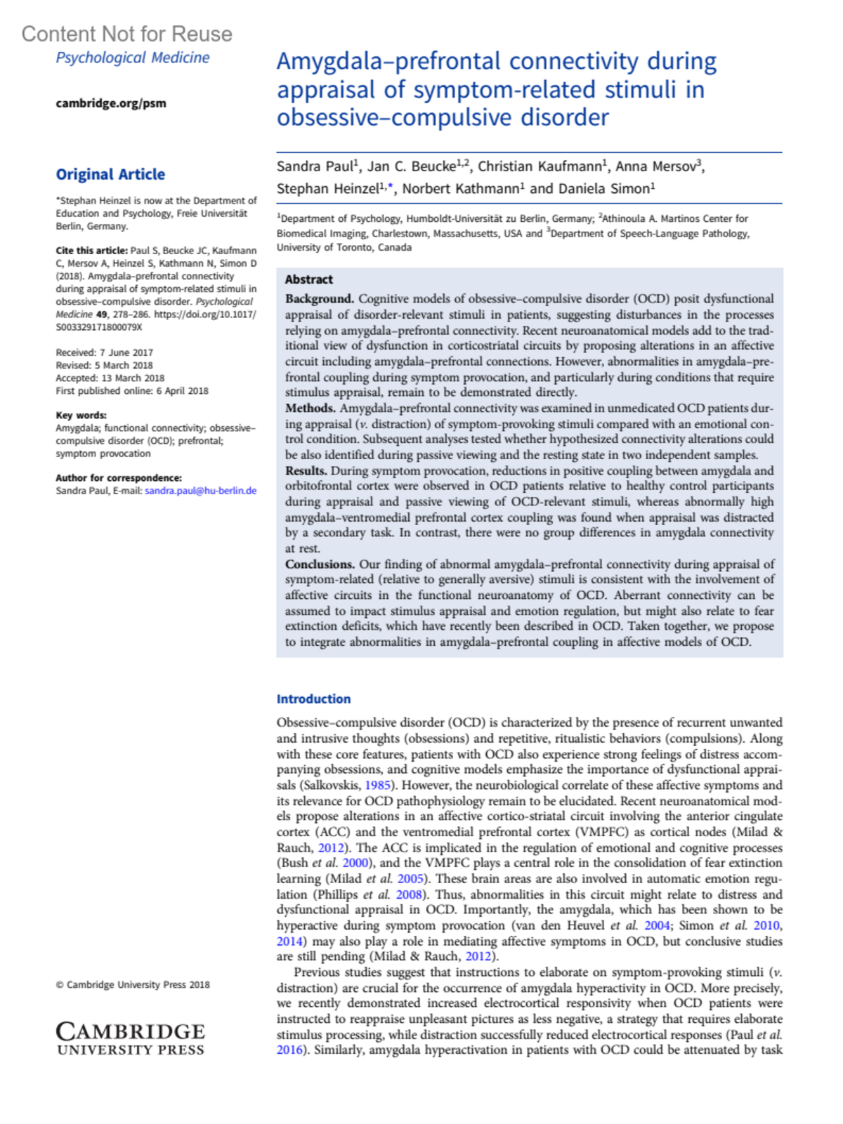 Amygdala–prefrontal connectivity during appraisal of symptom-related stimuli in obsessive–compulsive disorder