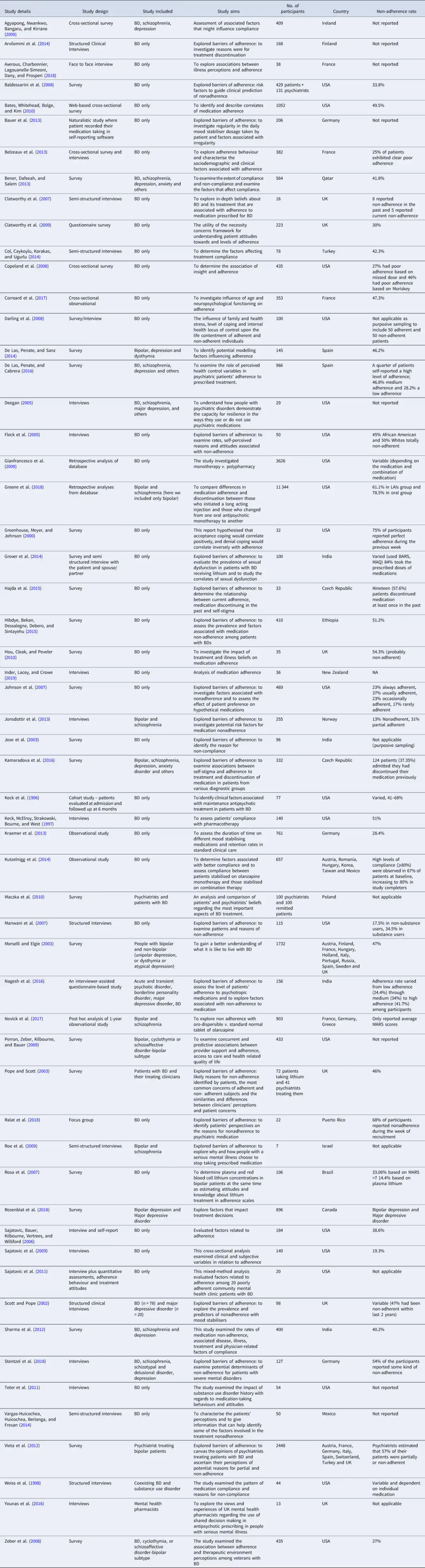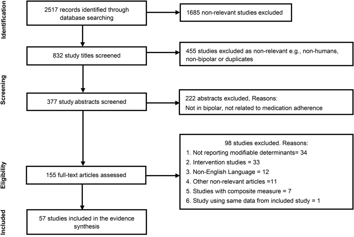 We included primary, qualitative and quantitative studies published in the English language and studies explicitly reporting modifiable determinants of medication adherence in BD in adults. We excluded reviews, intervention studies to improve adherence, case reports, clinical guidelines or general disease management articles, studies involving short-term treatment of acute agitation or treatment other than medication such as psychotherapy.