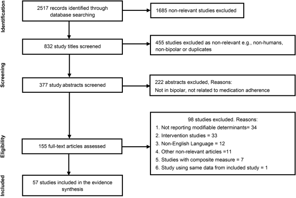 From the 2517 studies retrieved, we included 57, comprising 32 894 patients and clinicians. Figure 1 provides the screening process, number of retrieved studies, number of studies included and excluded during title screening, abstract screening and full text screening as well as the reasons for exclusion. The primary reasons for exclusion at full-text screening were failure to report modifiable determinants or reporting an intervention to address adherence.