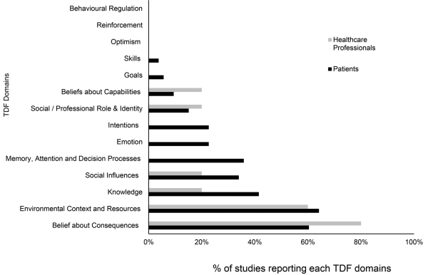 Comparison of TDF domains reported by patients and clinicians. No. of patients only studies = 50; no. of clinicians only studies = 2; no. of studies including patients and clinicians = 3. Two studies exploring researchers' perspectives were not included in this graph.