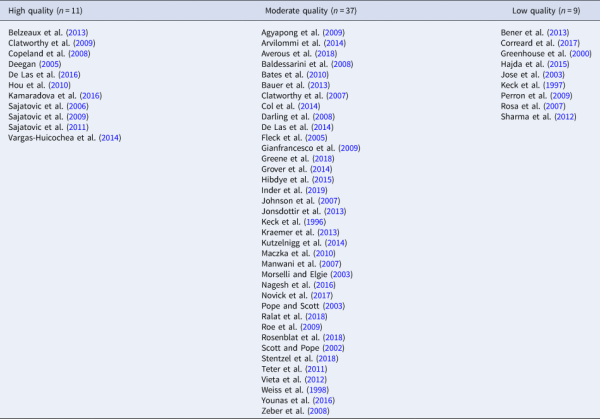 Summary characteristics such as study design, participant details and, country in which the included study was conducted are presented in Table 1. Fifty studies explored determinants from the perspective of patients and two (Vieta et al., ; Younas, Bradley, Holmes, Sud, & Maidment, ) from clinicians' perspective. Three studies included both patient and clinician perspectives (Baldessarini, Perry, & Pike, ; Maczka, Siwek, Skalski, Grabski, & Dudek, ; Pope & Scott, ). Further two studies were from the researcher's perspective (Gianfrancesco, Sajatovic, Tafesse, & Wang, ; Greene et al., ). However, none of the studies included carers. Most of the included studies collected data via surveys or interviews. The majority (79%) of the studies were conducted in the USA and Europe. A majority of the studies (64%) were focused purely on BD. Of the 57 included studies, 33% (Arvilommi et al., ; Baldessarini et al., ; Bauer et al., ; Fleck, Corey, Strakowski, & Keck, ; Grover, Ghosh, Sarkar, Chakrabarti, & Avasthi, ; Hajda et al., ; Johnson et al., ; Jonsdottir et al., ; Jose, Bhaduri, & Mathew, ; Manwani et al., ; Nagesh, Kishore, & Raveesh, ; Pope & Scott, ; Ralat, Depp, & Bernal, ; Roe, Goldblatt, Baloush-Klienman, Swarbrick, & Davidson, ; Scott & Pope, ; Stentzel et al., ; Vieta et al., ) explicitly focused on exploring barriers to adherence. Table 2 describes the quality of the included studies. The majority (65%) of the studies was of moderate quality, 19% were of high quality and 16% were of low quality.