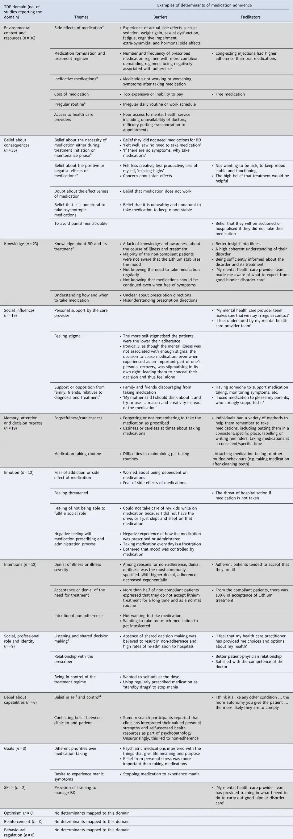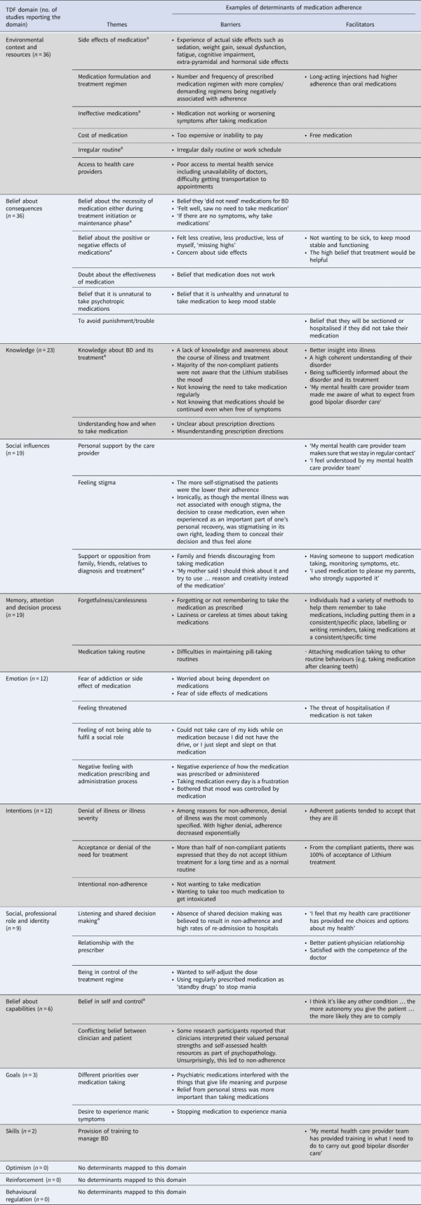 Other TDF domains (and corresponding themes of determinants) reported in 20% or more studies, among all studies, were ‘Knowledge’ (whether the patient had sufficient knowledge about BD or its treatment); ‘Social influences’ (support or opposition from family, friends, relatives, clinicians regarding adherence); ‘Emotion’ (fear of addiction to or side effect from medication); ‘Memory, attention, and decision process’ (forgetfulness/carelessness with medication taking) and ‘Intentions’ (denial of illness or need for treatment).