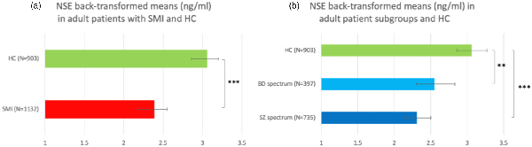 Back-transformed plasma NSE means in (a) adult patients with SMI and HC and (b) adult patients with SZ and BD and HC. **p = 0.005, ***p < 0.001.