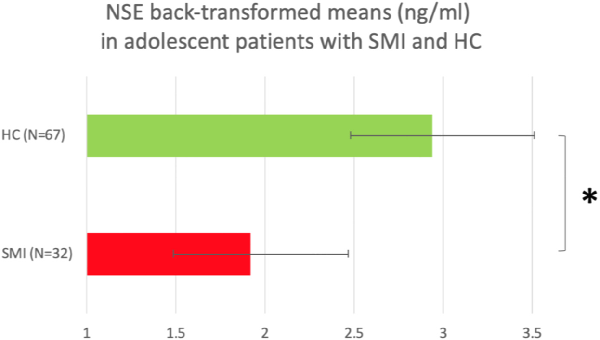 Back-transformed plasma NSE means in adolescent patients with SMI and adolescent HC. *p < 0.05.