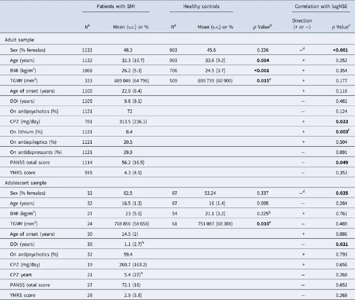 Among adults, we restricted the analysis to patients not currently on any psychotropic medication (n = 156) and HC, and applied an ANOVA to determine main effects of disease status and sex on logNSE. Both disease status and sex had still significant main effects on logNSE, with lower logNSE in patients than HC (p = 0.004) and in women than men (p = 0.001). Among adult patients, the current use of lithium (p = 0.003) and the CPZ (p = 0.023) were positively correlated with logNSE. Among adolescent patients, neither current use of antipsychotics, CPZ nor CPZ years were significantly correlated with logNSE (Table 1).