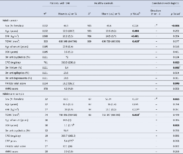 We included 333 adult patients and 509 adult HC (adult MRI sample), and 24 adolescent patients and 61 adolescent HC (adolescent MRI sample). In both samples, females had smaller TGMV than males (p < 0.001 for both) assessed with t tests, while age was negatively correlated with TGMV assessed with Spearman's correlations (p < 0.001 and p = 0.005, respectively). Applying ANCOVAs controlling for sex, age and scanner, patients had lower TGMV than HC in the adult but not the adolescent sample (Table 1). TGMV was not correlated with logNSE in any sample (Table 1).