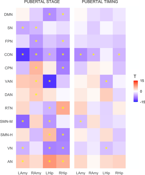 Associations between resting-state corticolimbic connectivity and (i) pubertal stage and (ii) pubertal timing. Heatmaps represent T statistics (T) of models on the full dataset, while significance (*) is based on FDR 0.05 for both discovery and replication sets. LAmy, Left Amygdala; RAmy, Right Amygdala; LHip, Left Hippocampus; RHip, Right Hippocampus; DMN, Default Mode Network; SN, Salience Network; FPN, Frontoparietal Network; CON, Cingulo-Opercular Network; CPN, Cingulo-Parietal Network; VAN, Ventral Attention Network; DAN, Dorsal Attention Network; RSN, Retrosplenial Temporal Network; SMN-M, Somatomotor Network – Mouth; SMN-H, Somatomotor Network – Hand; VN, Visual Network; AN, Auditory Network.