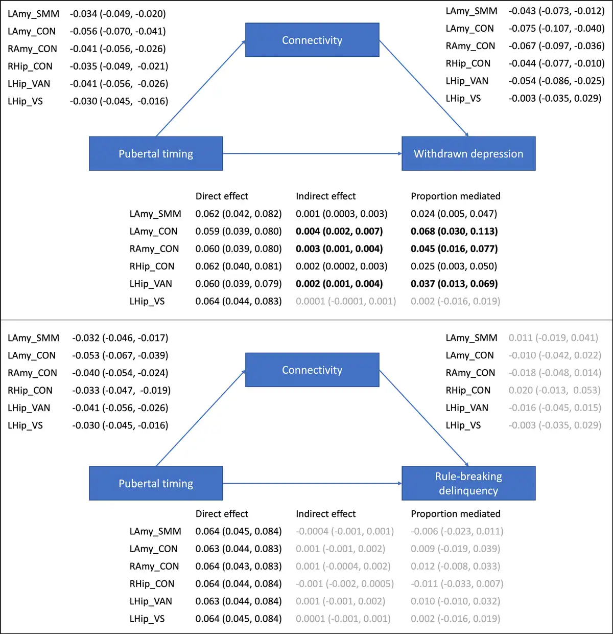 Mediation models examining indirect pathways between pubertal timing and mental health problems via resting-state corticolimbic connectivity (estimates and 95% CIs presented). LAmy, Left Amygdala; RAmy, Right Amygdala; LHip, Left Hippocampus; RHip, Right Hippocampus; CON, Cingulo-Opercular Network, Somatomotor Network – Mouth; VAN, Ventral Attention Network; VN, Visual Network.