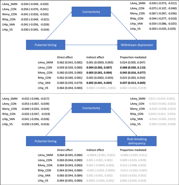 Mediation analyses examined whether the six corticolimbic connections that were significantly related to pubertal timing mediated pathways to mental health problems (statistics from all multivariate models are presented in online Supplementary Table S4). As illustrated in Fig. 2, Bayesian analyses revealed a direct effect of pubertal timing on withdrawn depression, as well as an indirect effect mediated via five of six corticolimbic connections (accounting for up to 7% of the total effect). In other words, CIs revealed a 95% probability that the direct and indirect effects lie within intervals that do not contain zero. Specifically, decreased connectivity (of left amygdala-CON, right amygdala-CON, right hippocampus-CON, left hippocampus-VAN and left amygdala-SMN-M) mediated the relationship between earlier pubertal timing and higher levels of withdrawn depression. Of note, the most support was evident (at 99% credibility intervals) for bilateral amygdala-CON and left hippocampus-VAN connectivity, and there remained support for these three connections when controlling for race/ethnicity and INR (refer to Supplement). There was also a direct effect of pubertal timing on rule-breaking problems, with earlier timing predicting higher levels of delinquency. However there were no indirect pathways between timing and rule-breaking problems via corticolimbic connectivity.
