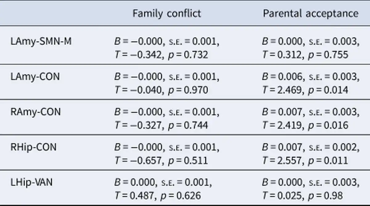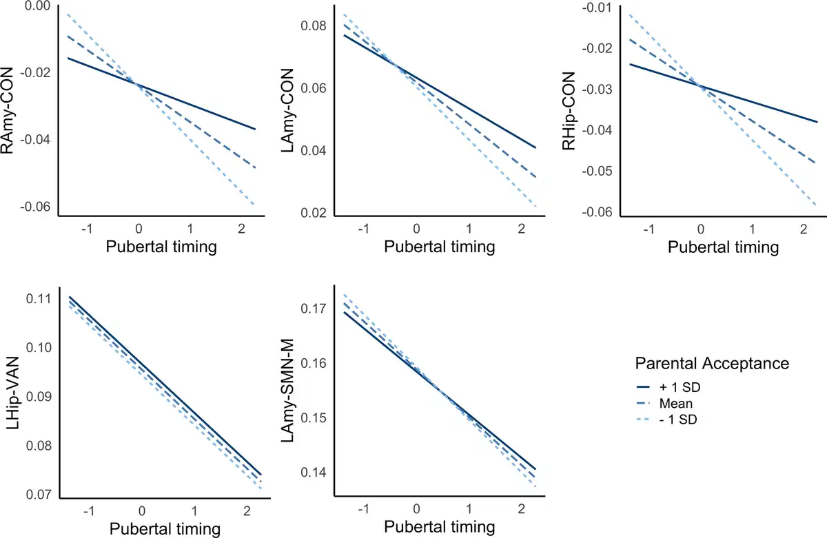 In conclusion, the current investigation of the ABCD cohort highlights neural mechanisms that partially account for the increased risk for depression in adolescents experiencing puberty earlier than their peers. In particular, findings implicated decreased connectivity between limbic structures and the CON involved in higher-order cognitive control. Exploratory analyses provided preliminary support for the role of positive family environments in buffering against neural risk patterns (involving the amygdala) in adolescents undergoing earlier pubertal maturation. Conversely, negative family environments may exacerbate these neural risk pathways, and adolescents experiencing earlier puberty in such contexts represent key targets for interventions during the early adolescent years.