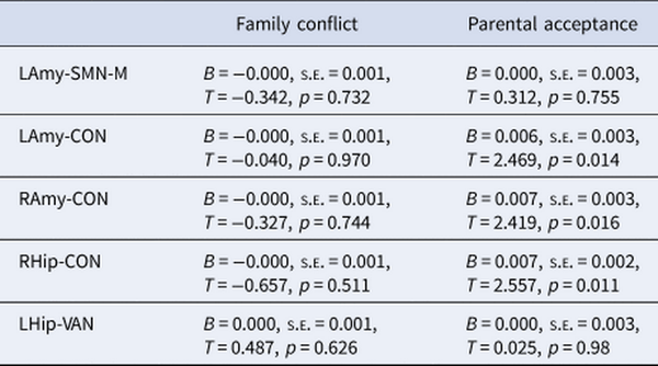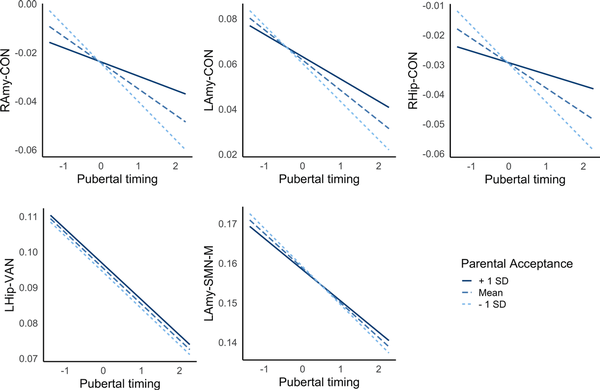 Finally, there were significant interactions between the family environment and pubertal timing in predicting bilateral amygdala- and right hippocampus-CON connectivity; low levels of parental acceptance exacerbated the negative relationship between timing and connectivity, while high levels buffered against this pattern. Further, there was some support for contextual amplification models as parental acceptance moderated indirect pathways between pubertal timing and withdrawn depression via amygdala-CON connectivity, such that indirect pathways were not present at high levels of parental acceptance. This finding adds to the only prior study (to our knowledge) to examine and identify interactions between pubertal timing and parenting in relation to adolescent neural functioning (Barbosa et al., ). Individuals undergoing earlier puberty lean on their parents for guidance as they face the social challenges of this period (such as being physically different to their peers), and positive family environments are likely to be better equipped to support youth to navigate through these stressors (Rudolph & Troop-Gordon, ). Thus, to the extent that negative amygdala-CON connectivity reflects early activation of emotional circuits to respond to external stressors (Callaghan & Tottenham, ), we speculate that those in positive family environments may also receive external support with emotion regulation and may therefore require less reductions in connectivity (i.e. less acceleration of biological development) in response to socioemotional demands.