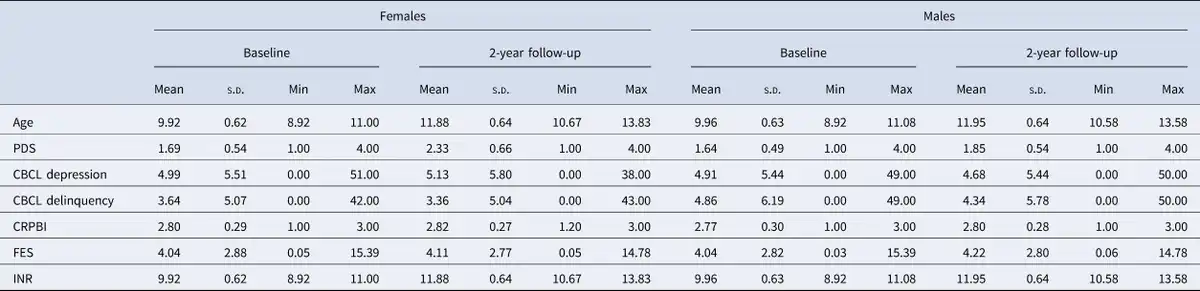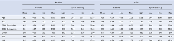 Adolescents completed the Children's Report of Parental Behavior Inventory (CRPBI) and Family Environment Scale (FES). CRPBI includes a parental acceptance subscale comprising 5 items (rated on a 3-point Likert Scale), which was completed about the primary caregiver. Of note, this measure was completed during the baseline and 1-year follow-up assessments, and thus there is an approximately 1-year time-lag with other variables of interest for a subset of datapoints (i.e. those relating to 2-year follow-up). FES includes a subscale on family conflict comprising 9 items about members of the family unit (e.g. ‘family members often criticize each other’). For both scales, items are summed, with higher scores reflecting greater parental acceptance and family conflict, respectively.