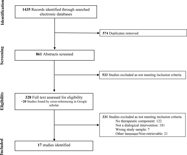 The systematic search retrieved 861 potential articles that were screened for eligibility after removing duplicates. Amongst these, a total of 17 studies were included within this systematic review, with interventions comprising cognitive-behavioral therapy for command hallucinations, Making sense of voices, Relating Therapy and Avatar Therapy (AT) as well as its variants. The PRISMA flowchart for the inclusion of studies in the systematic review is shown in Fig. 1. Concerning study design, we retrieved 7 case reports/case series, 1 observational qualitative study and 9 clinical trials ranging from very low to high quality of evidence. Refer to online Supplementary Material for a summary of the quality of evidence provided by the included studies. Below we briefly discuss the therapeutic approaches of each relational intervention and examine their effects on the severity of AH and of other symptoms of the illness.