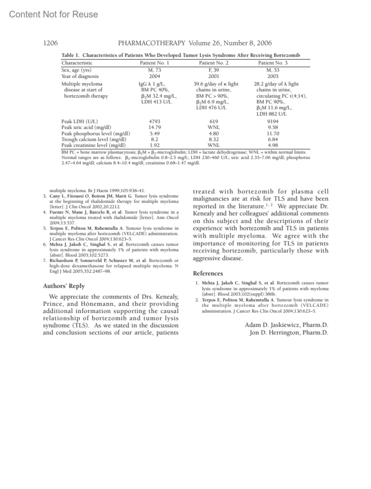 Tumor Lysis Syndrome Early After Treatment with Bortezomib for Multiple Myeloma