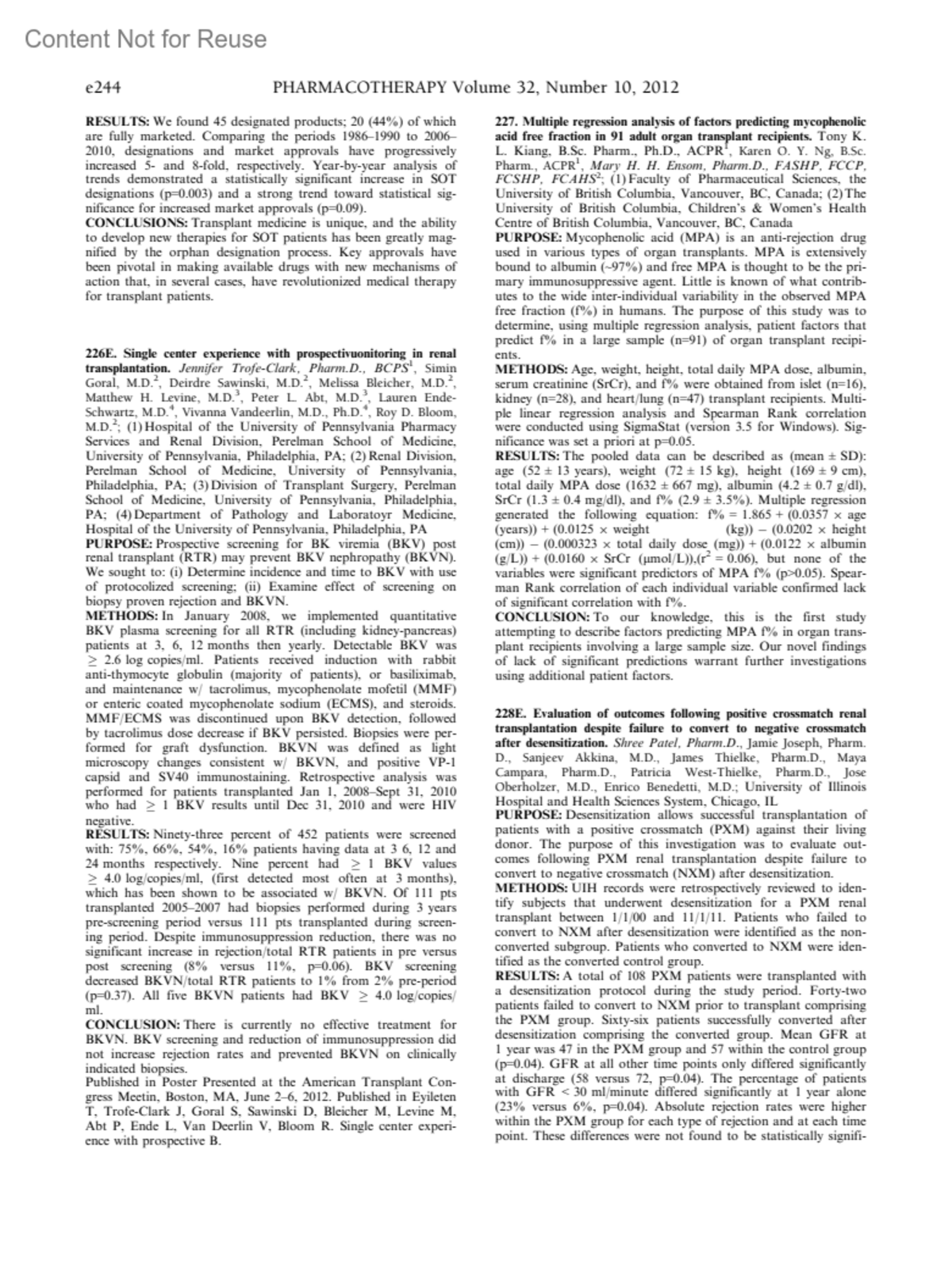 Pharmacotherapy: The Journal Of Human Pharmacology & Drug Therapy 32(10):p e244, October 2012.