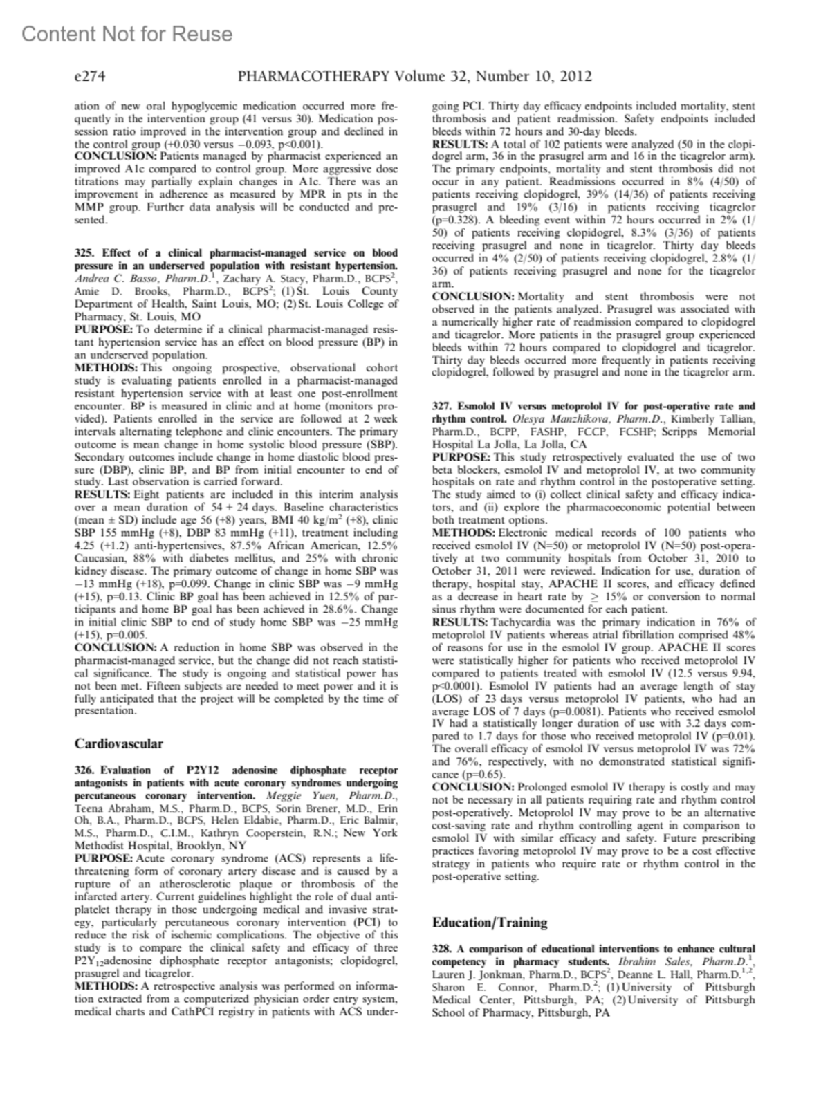 Pharmacotherapy: The Journal Of Human Pharmacology & Drug Therapy 32(10):p e274, October 2012.