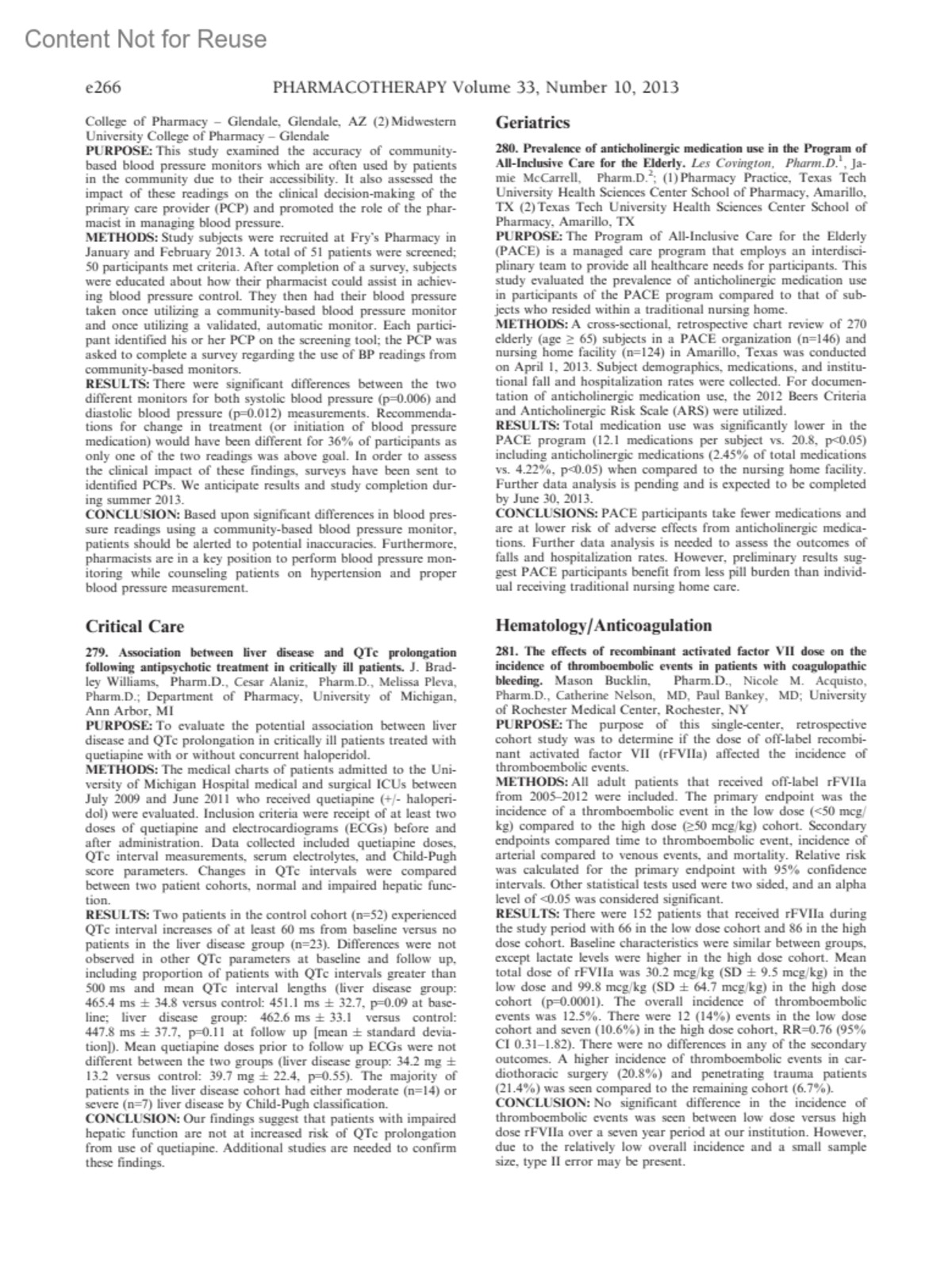 Pharmacotherapy: The Journal Of Human Pharmacology & Drug Therapy 33(10):p e266, October 2013.