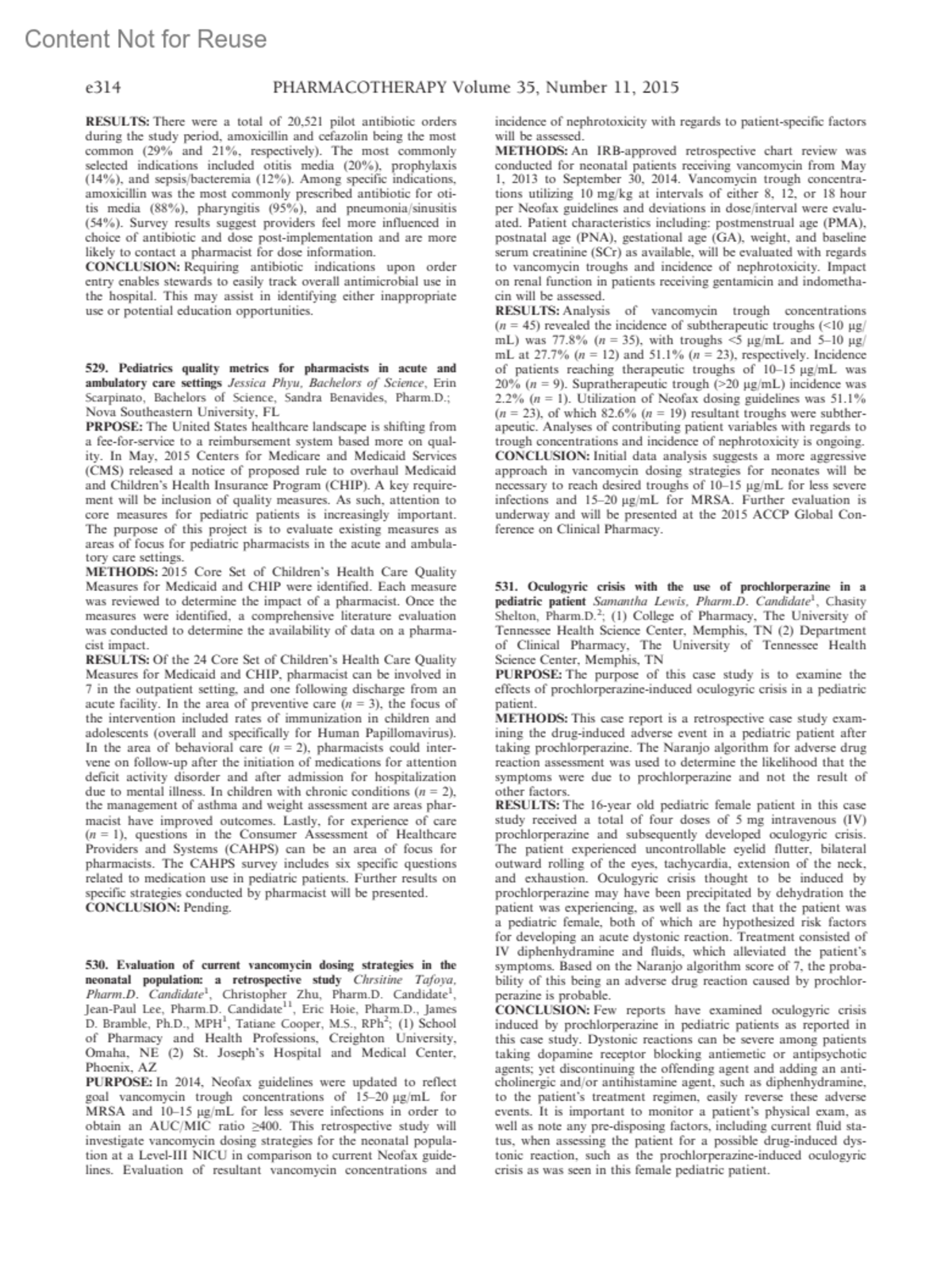 Pharmacotherapy: The Journal Of Human Pharmacology & Drug Therapy 35(11):p e314, November 2015.
