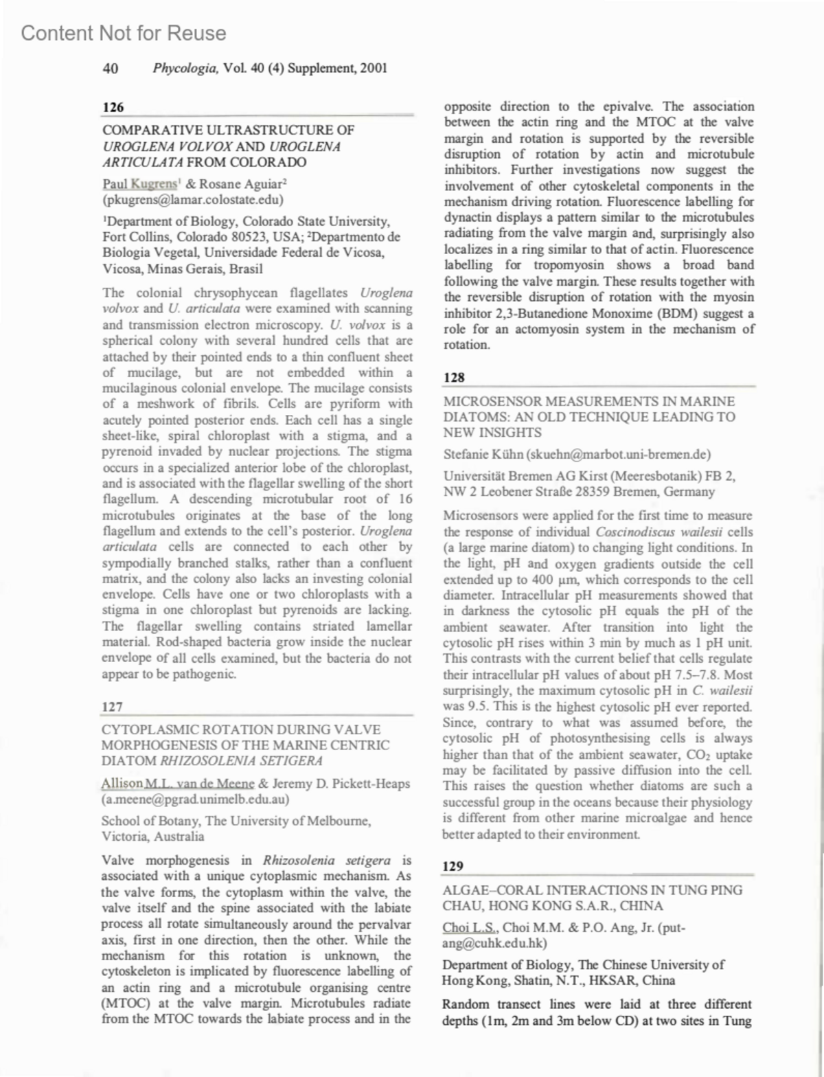 ALGAE-CORAL INTERACTIONS IN TUNG PING CHAU, HONG KONG S.A.R., CHINA129Choi, L. S.Choi, M. M.Ang, P. O. Jr.Author informationDepartment of Biology, The Chinese University of Hong Kong, Shatin, N.T., HKSAR, China([email protected])Phycologia 40(4):p 40-41, July 2001.Copyright © 2001 Allen Press