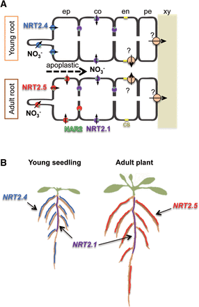 Schematic illustration summarizing the function of NRT2 transporters in Arabidopsis roots under low N availability. Spatial and temporal localization of AtNRT2.1 (NRT2.1, purple), AtNRT2.4 (NRT2.4, blue) and AtNRT2.5 (NRT2.5, red) in (A) root tissues and (B) whole root systems under low N availability. (A) The NRT2.4/NAR2 complex is localized to the outer (soil) side of the epidermal cells of the roots of young seedlings. The NRT2.5/NAR2 complex is expressed in the epidermal cells of the roots of adult plants. NRT2.4 and NRT2.5 are responsible for nitrate uptake directly from the soil. Nitrate can apoplastically penetrate toward cortex cells to be absorbed by the NRT2.1/NAR2 complex. NAR2 (AtNAR2.1) is shown as green circles. Orange circles indicate a putative high-affinity exporter involved in xylem loading of nitrate. (B) NRT2.1 is strongly expressed in the older part of the root system, while NRT2.4 and NRT2.5 are preferentially expressed in the younger part of the roots of young seedlings and adult plants, respectively. ep, epidermis; co, cortex; en, endodermis; pe, pericycle; xy, xylem; cs, casparian strip