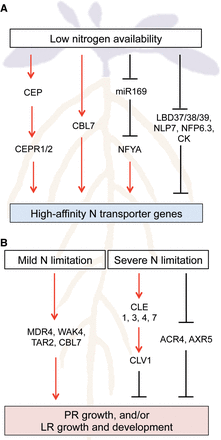 Also based on the up-regulation of gene expression under N limitation, members of the CLAVATA3/ESR-RELATED (CLE) gene family are part of a (probably) different regulatory mechanism that restrictively controls the expansion of the lateral root system in N-limited environments in Arabidopsis (). Expression of peptides CLE1, 3, 4 and 7 is induced under N limitation chiefly in the root pericycle cells. Their overexpression leads to reduced lateral root growth. CLE peptides are ligands of the CLAVATA1 (CLV1) leucine-rich repeat receptor-like kinases. CLV1, the receptor of CLE3, is expressed in phloem companion cells. The overexpression of CLE3 in a clv1 mutant background did not modify root architecture. In addition, the clv1 mutant was impaired for N-regulated lateral root primordia outgrowth. This signaling module is localized in the root vasculature, and acts under severe N limitation as a mechanism to prevent the expansion of the lateral root system into N-poor environments (Fig. 2B).