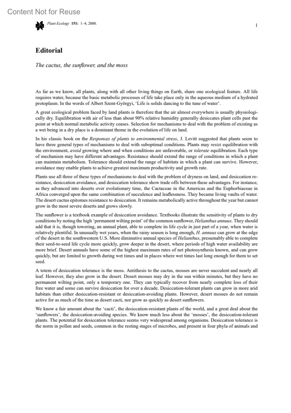 EditorialThe Cactus, the Sunflower, and the MossAlpert, PeterTuba, ZoltánAuthor information1University of Massachusetts at Amherst2Szent István University, Gödöllö (former Agricultural University of Gödöllö)Plant Ecology 151(1):p 1-4, November 2000.Copyright ©2000 Kluwer Academic Publishers