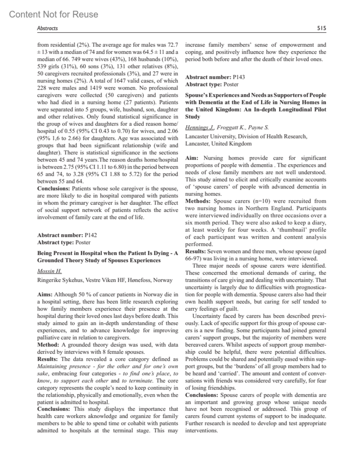 Being Present in Hospital when the Patient Is Dying - A Grounded Theory Study of Spouses ExperiencesMossin, H.Author informationRingerike Sykehus, Vestre Viken HF, Hønefoss, NorwayAbstract number: P142Abstract type: PosterPalliative Medicine 26(4):p 515, June 2012.Copyright ©2012Sage Publications