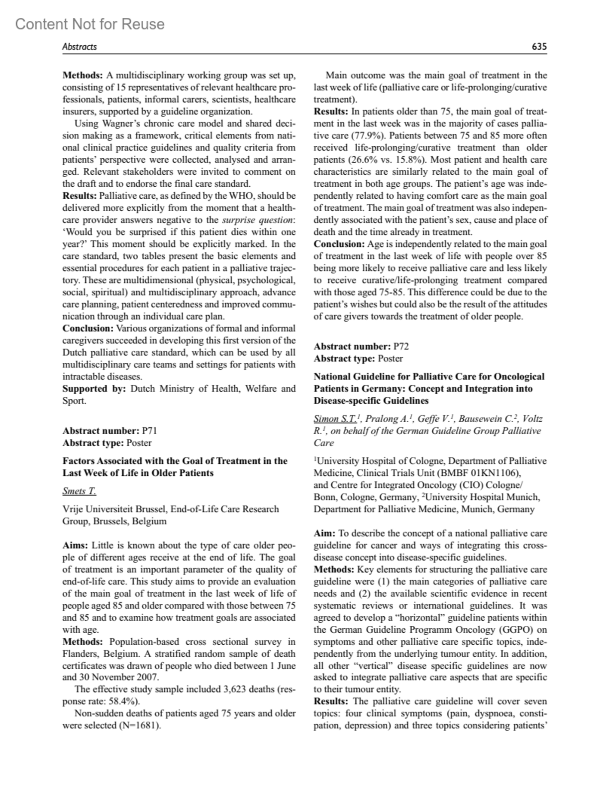 Factors Associated with the Goal of Treatment in the Last Week of Life in Older PatientsAbstract number: P71Smets, T.Author informationVrije Universiteit Brussel, End-of-Life Care Research Group, Brussels, BelgiumPalliative Medicine 28(6):p 635, June 2014.Copyright ©2014Sage Publications