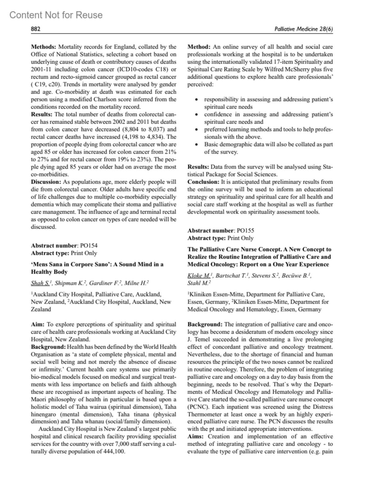 ‘Mens Sana in Corpore Sano’: A Sound Mind in a Healthy BodyAbstract number: PO154Shah, S.Shipman, K.Gardiner, F.Milne, H.Author information1Auckland City Hospital, Palliative Care, Auckland, New Zealand, 2Auckland City Hospital, Auckland, New ZealandPalliative Medicine 28(6):p 882, June 2014.Copyright ©2014Sage Publications