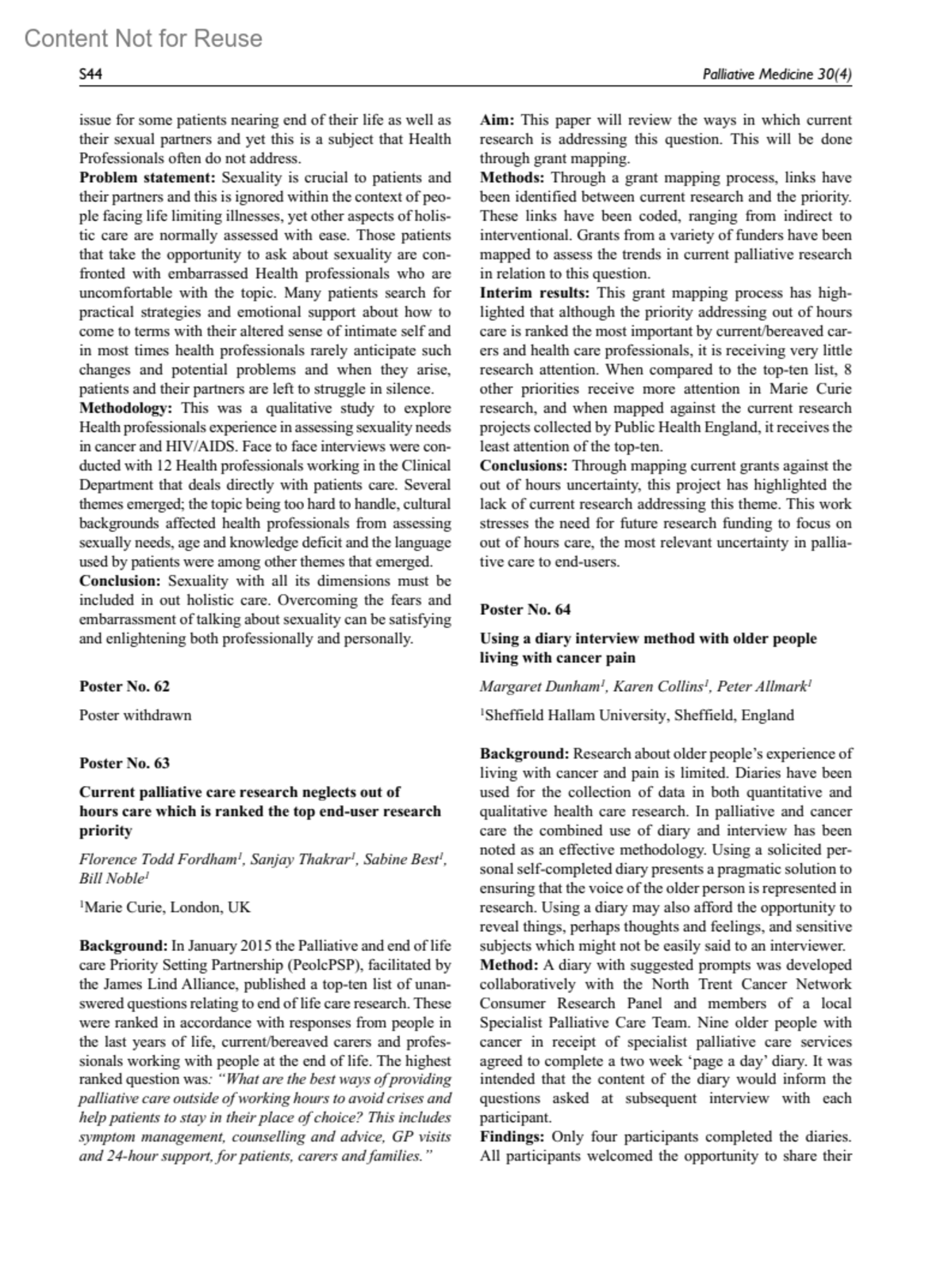 Current palliative care research neglects out of hours care which is ranked the top end-user research priority