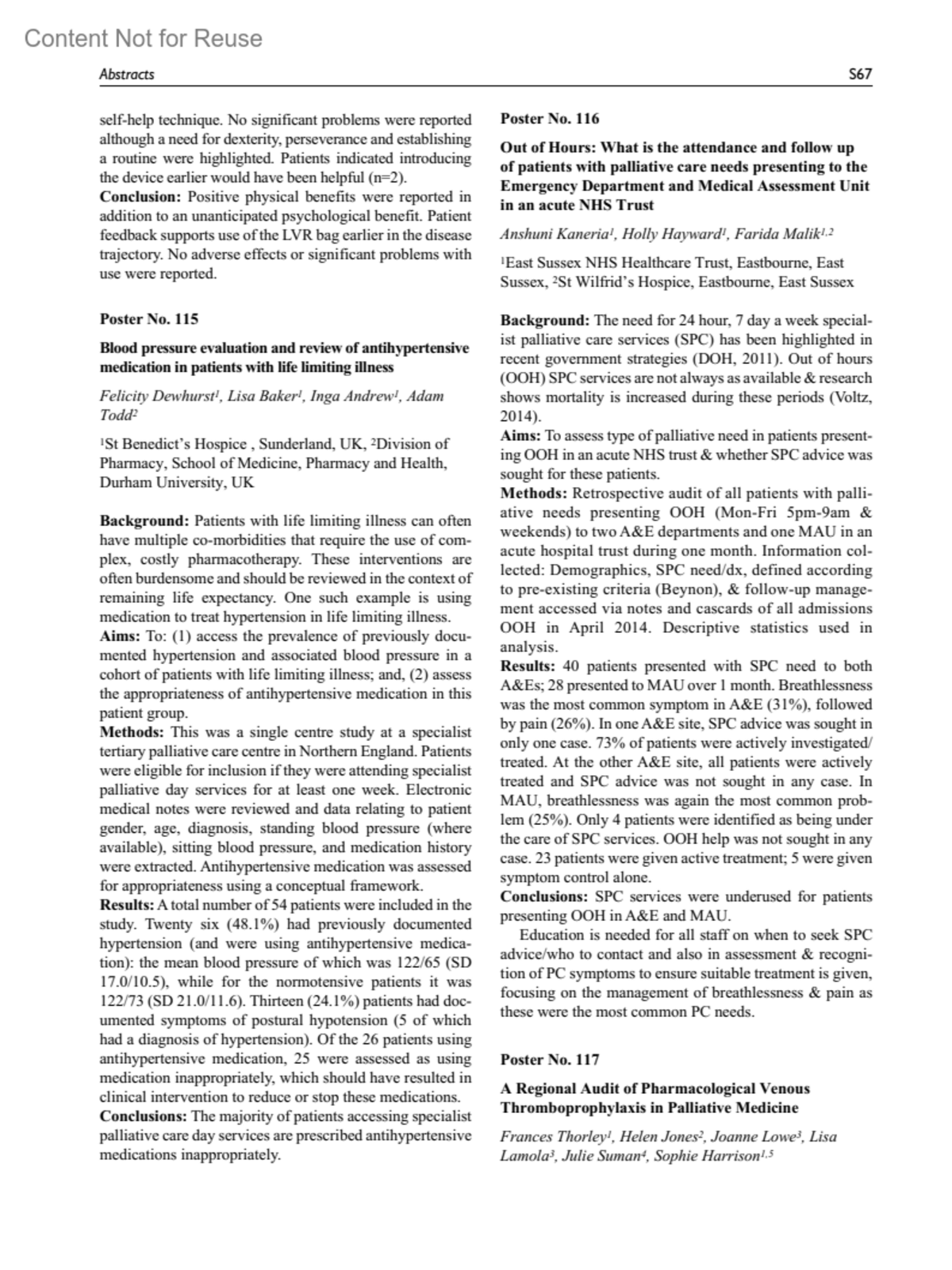 Out of Hours: What is the attendance and follow up of patients with palliative care needs presenting to the Emergency Department and Medical Assessment Unit in an acute NHS Trust