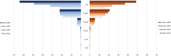 Globally, the burden of serious health-related suffering among cancer decedents is projected to increase rapidly among people aged over 70 (Figure 2). By 2060, 67% of people who die with cancer and experience serious health-related suffering will be over 70 years old, compared to 47% in 2016. The proportion of people aged over 70 will be highest in high income countries, where, by 2060, 83% of people who die with cancer and experience serious health-related suffering will be over 70, compared with 71% in upper-middle income countries, 52% in lower-middle income countries, and 38% in low income countries. By 2060, 54% of people who die with cancer and experience serious health-related suffering will be men, and of those over 70 years 57% will be men.
